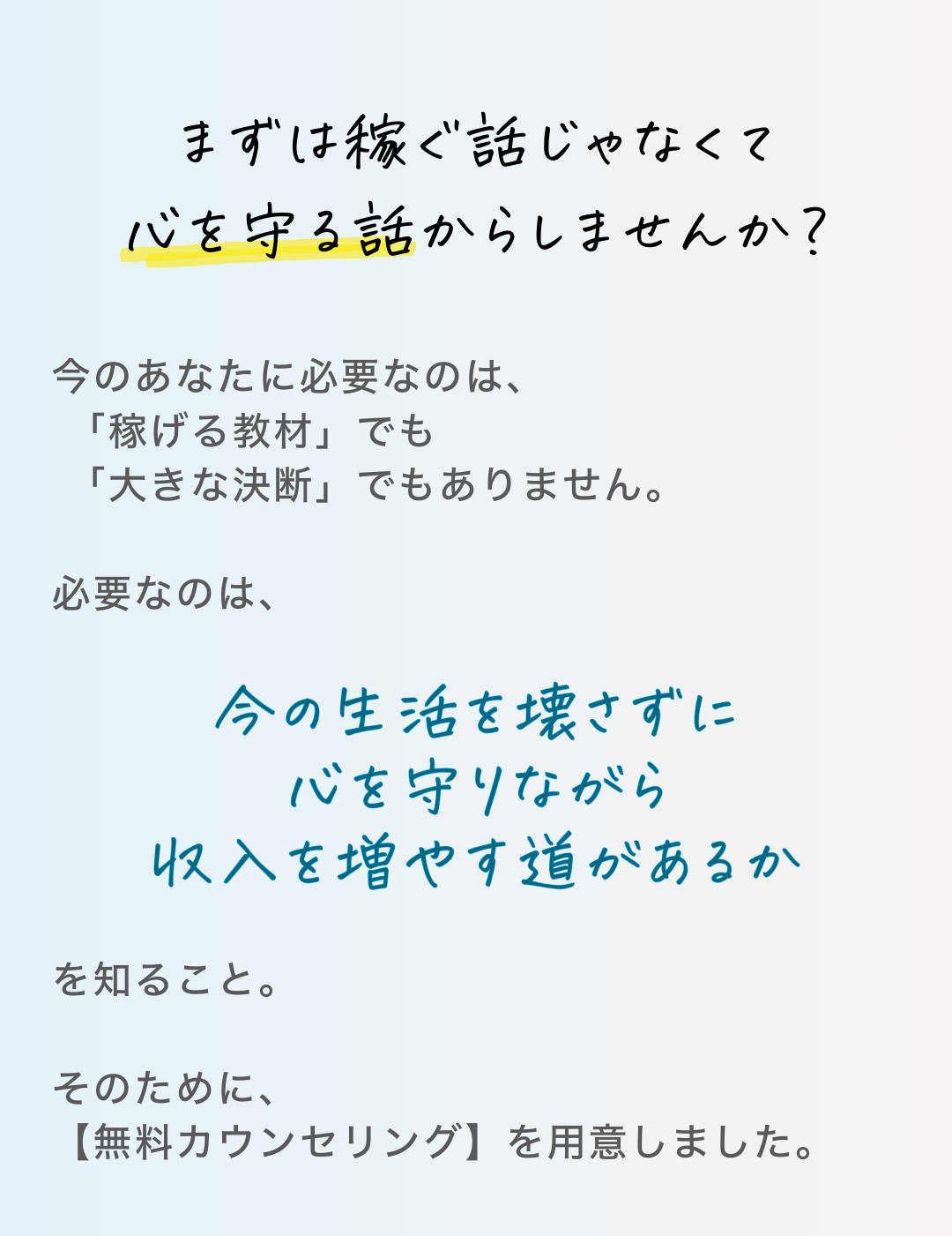 むしろ、その段階で話してほしいです。「今すぐ副業を増やす」のではなく、まずは心を守るための選択肢を一緒に整理します。